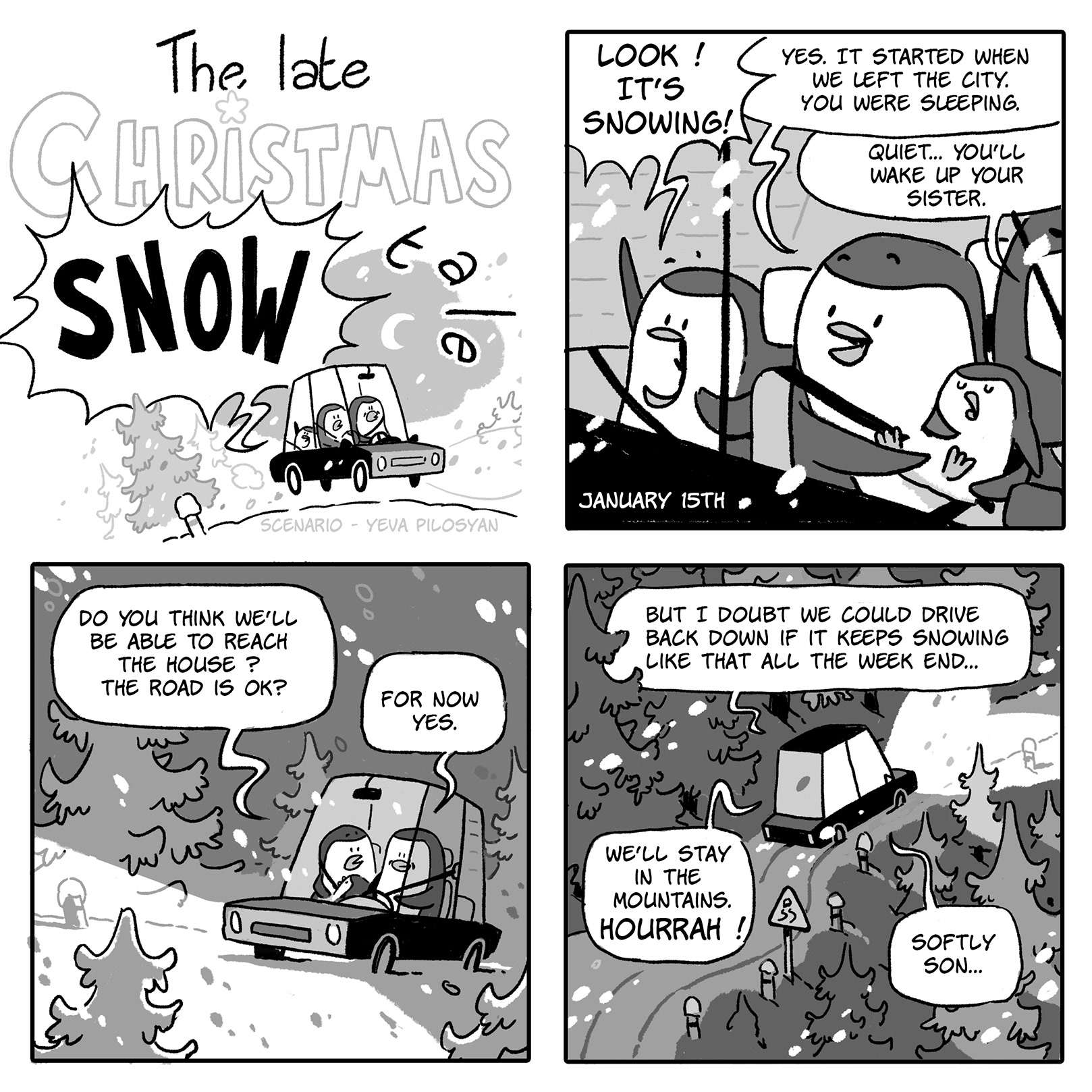 First we organized an online workshop about comics and asked students to write stories about their memories of winter. We then selected the best stories and I drew them, together with some personnal memories.